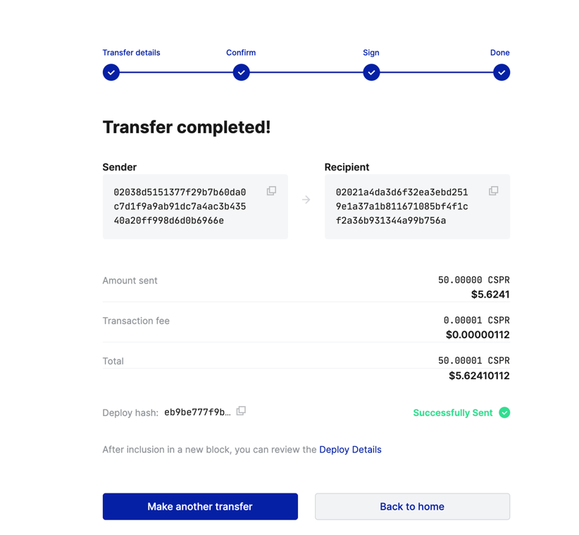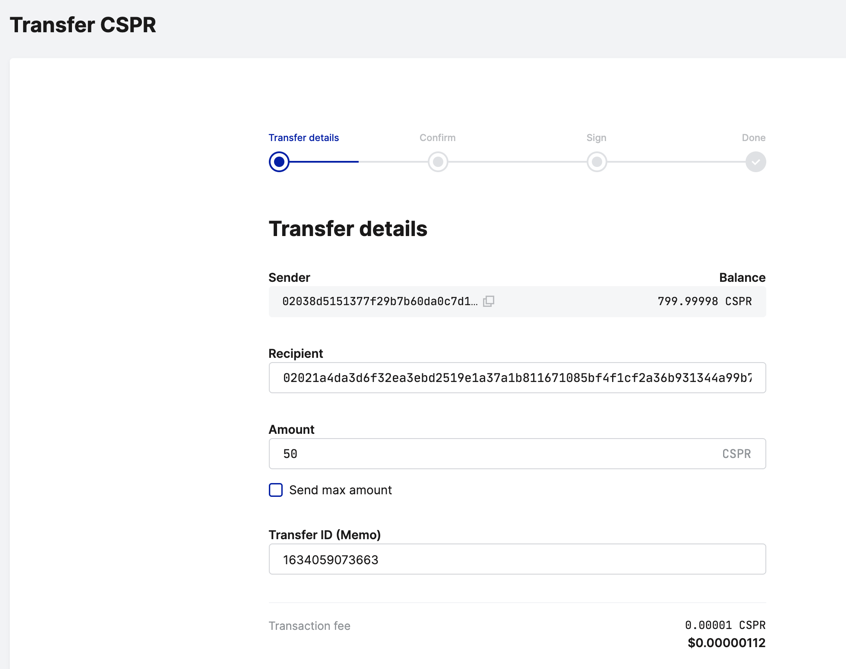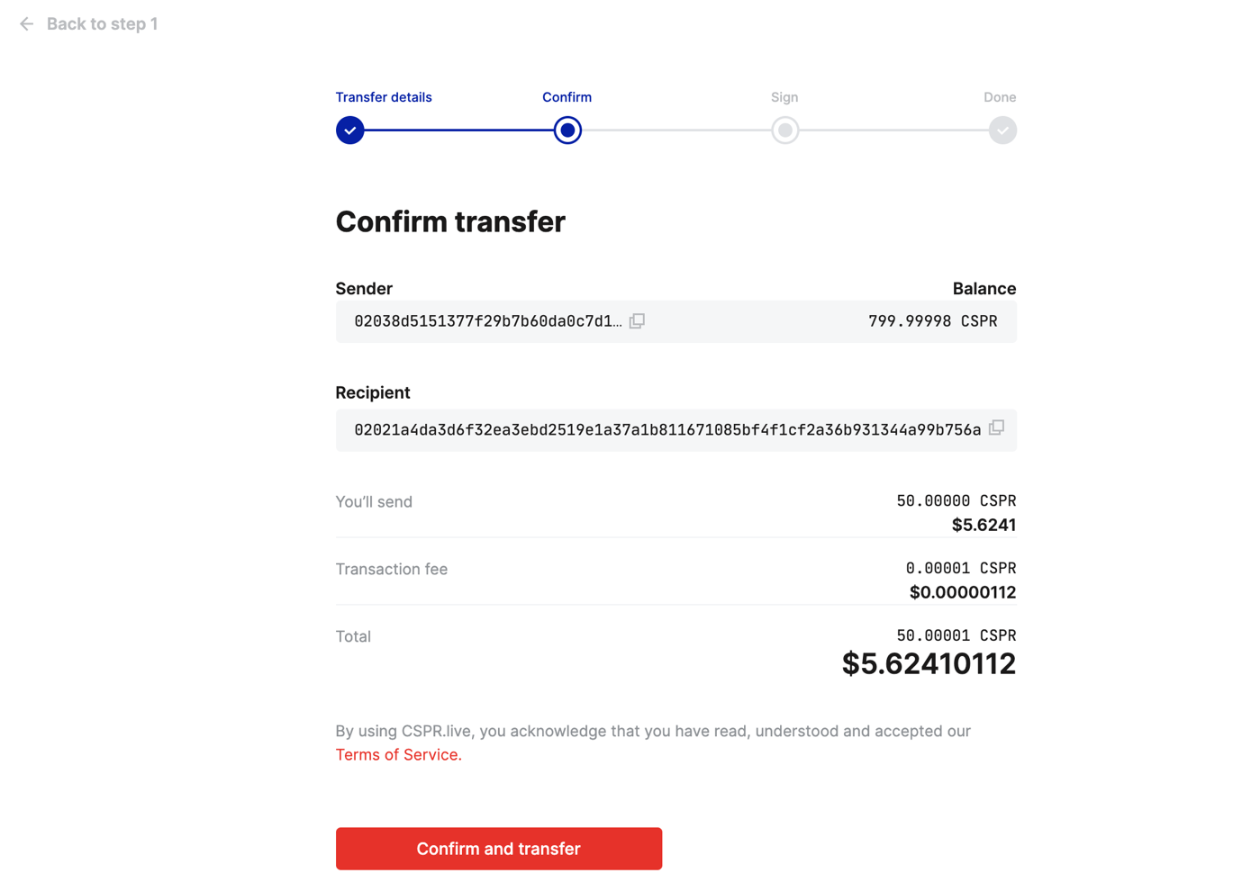 Click Next to proceed. The following figure shows an example transfer of 50 CSPR.