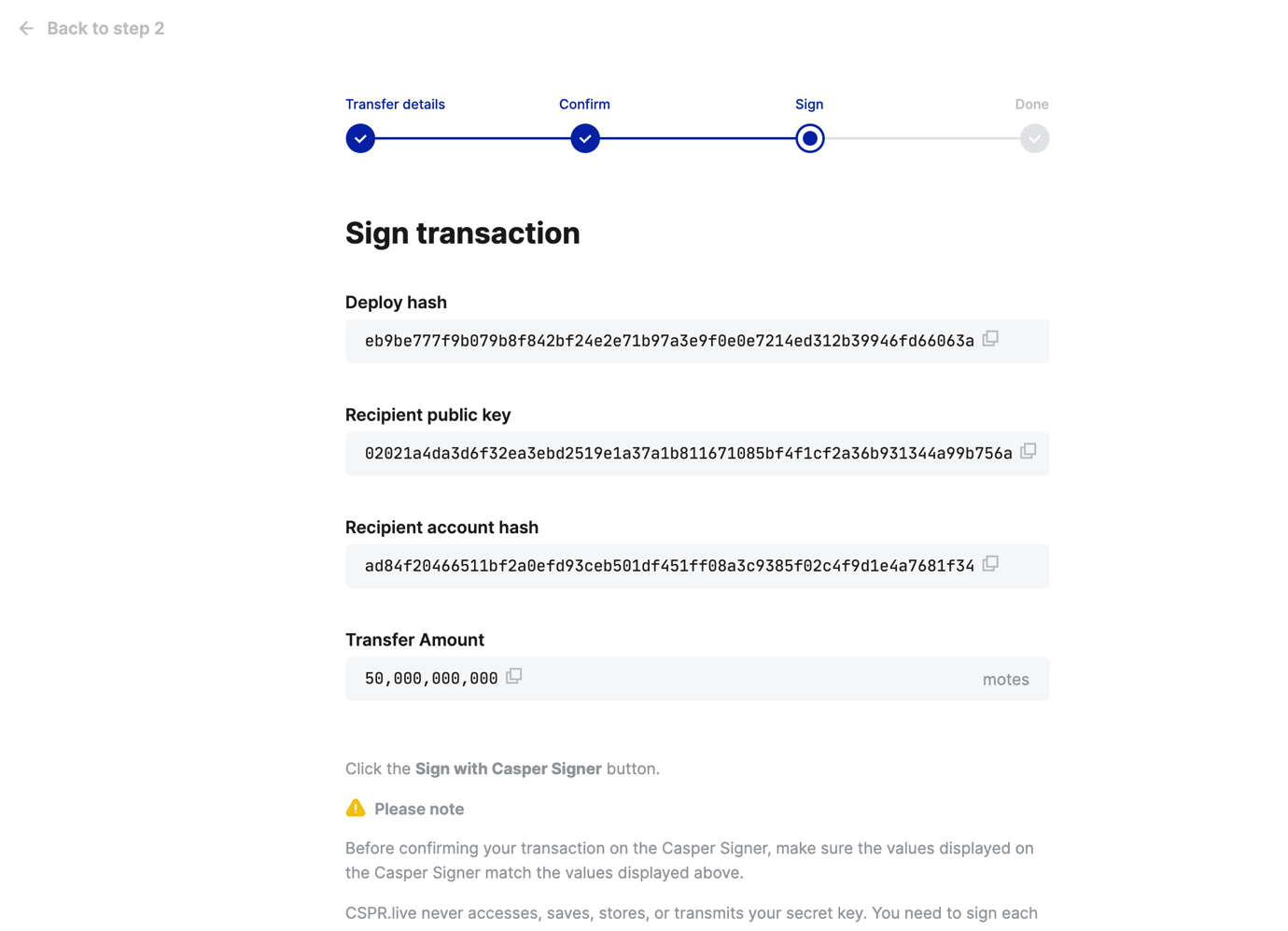 Sign the transaction by selecting the Sign with Casper Signer button to proceed to the next step. Here you can review the following important fields: